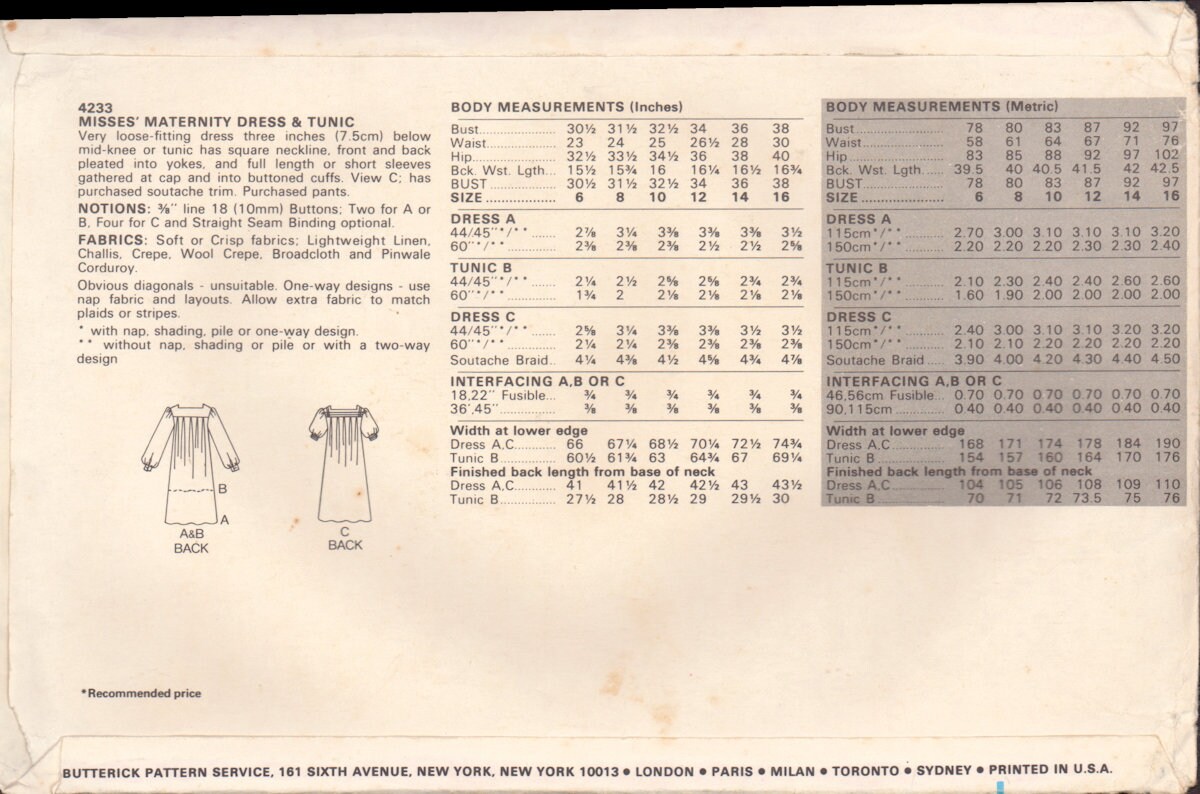 Butterick 4233 Sewing Pattern Maternity Dress And Tunic Size Etsy